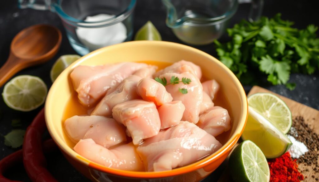 Marinating chicken right is key to safety and flavor. Two big mistakes are over-marination and cross-contamination. Over-marination makes the chicken mushy. Cross-contamination is a serious health risk.
