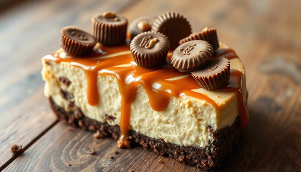 A Reese’s Caramel Cheesecake is a tasty dessert. It mixes cheesecake’s creamy texture with Reese’s peanut butter cups and caramel flavors.